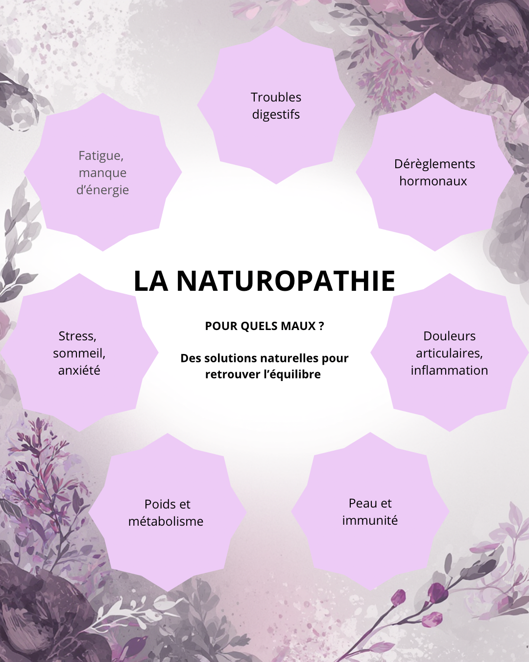 Je vous propose un accompagnement global, naturel et profondément humain : alimentation, hygiène de vie, rythme, stress, émotions… Tout est lié.